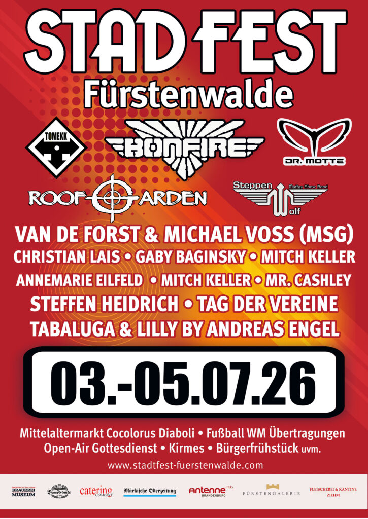 Während der drei Tage treten in Fürstenwalde zahlreiche nationale und lokale Bands und Künstler auf. Mit dabei sind neben vielen anderen Künstler:innen u.A. Bonfire, Dr. Motte, Dj Tomekk, Mitch Keller, Christian Lais, Gaby Baginsky und Roof Garden. Weitere Programmhöhepunkte sind das Kindermusical Tabaluga und Lilly by Andreas Engel, die Übertragung der Fußball-WM Spiele und der große Mittelaltermarkt der Gruppe Cocolorus Budenzauber.